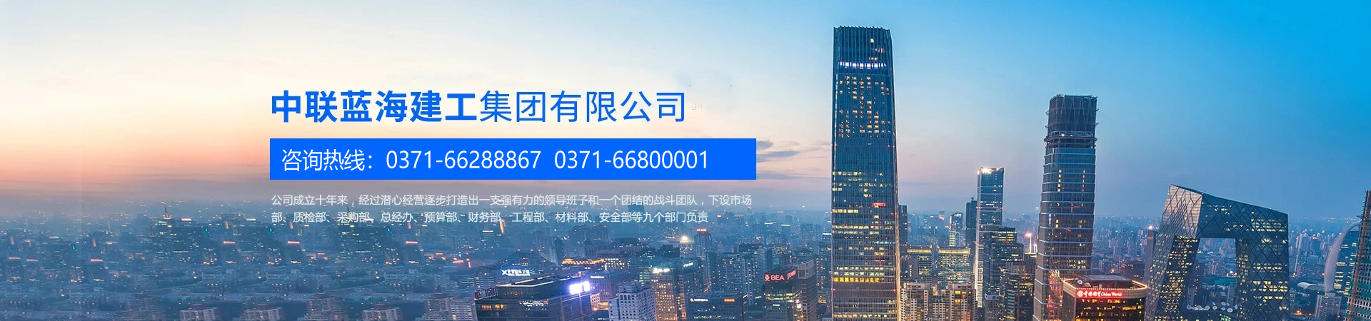 中联蓝海拥有雄厚的资质与技术实力,充分体现了公司在专业领域的雄厚实力;公司注册资金高达6亿元,拥有一支技术精湛、经验丰富的精英团队,包括高级工程师、中级工程师、助理工程师以及各类技术工人。此外,公司还汇聚了多名壹级、贰级注册建造师,为每一个项目的顺利实施提供坚实的技术保障。 科学管理与严谨运营公司下设市场部、质检部、采购部、总经办、预算部、财务部、工程部、材料部、安全部等九大核心部门,构建了科学、有效的管理体系。从项目规划到竣工验收,我们以精细化的管理流程确保每一个环节的完整交付,为客户创造更好的价值。 多元化布局与未来愿景历经十余年的稳健发展,中联蓝海已从单一的工程施工企业,逐步拓展为集房地产开发与经营、建筑工程、建筑材料、防水材料、建筑安装施工、市政公用工程、防水防腐保温、消防设施、通信工程、园林绿化工程、装饰装修、水利工程、电力工程、路桥工程、新能源技术开发、钢结构工程、人防工程、机电设备安装工程、教育、金融、物业、酒店、服装、投资、咨询等业务于一体的综合性集团公司。